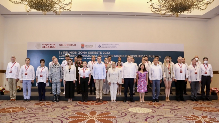 En Tuxtla Gutiérrez, Chiapas, la funcionaria federal estuvo acompañada por el gobernador, Rutilio Escandón; el presidente municipal, Carlos Orsoe, y las secretarias y secretarios de Seguridad de Chiapas, Campeche, Oaxaca, Quintana Roo, Tabasco, Veracruz y Yucatán.