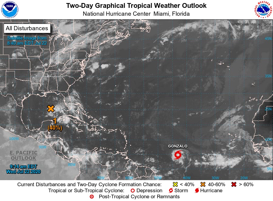 Chetumal, Q. Roo, Miércoles 22 de julio de 2020, poderycrítica.- El Centro Nacional de Huracanes de Miami, Florida, Estados Unidos, informó que la mañana de este miércoles evolucionó de depresión tropical número Siete a tormenta tropical “Gonzalo”.