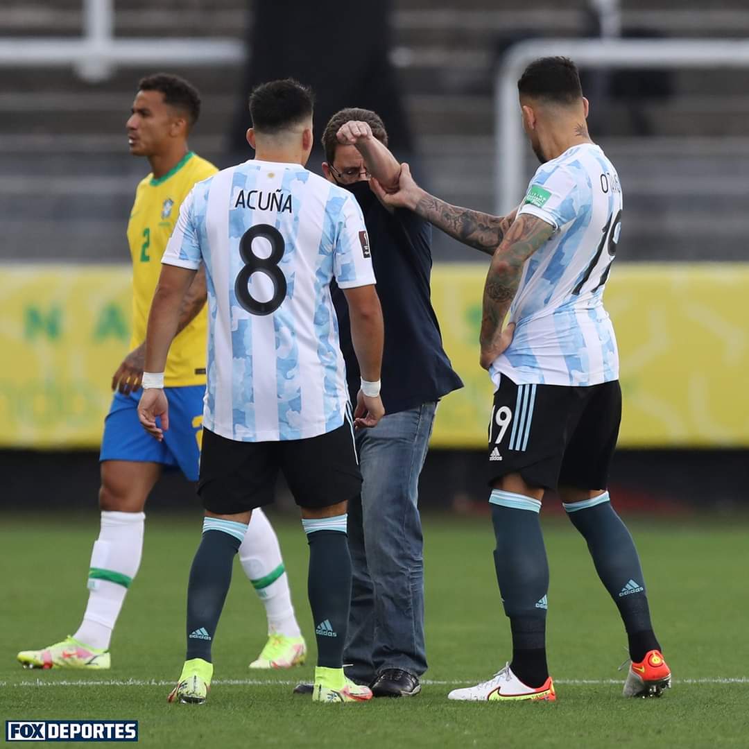 El personal de Anvisa detuvo el juego a los 6 minutos para retirar a Emiliano Martínez, Giovani Lo Celso, Cristian Romero y Emiliano Buendía, quienes llegaron procedentes de Inglaterra, haciendo una escala en Venezuela y, supuestamente, declararon falsamente al momento de ingresar a Brasil.