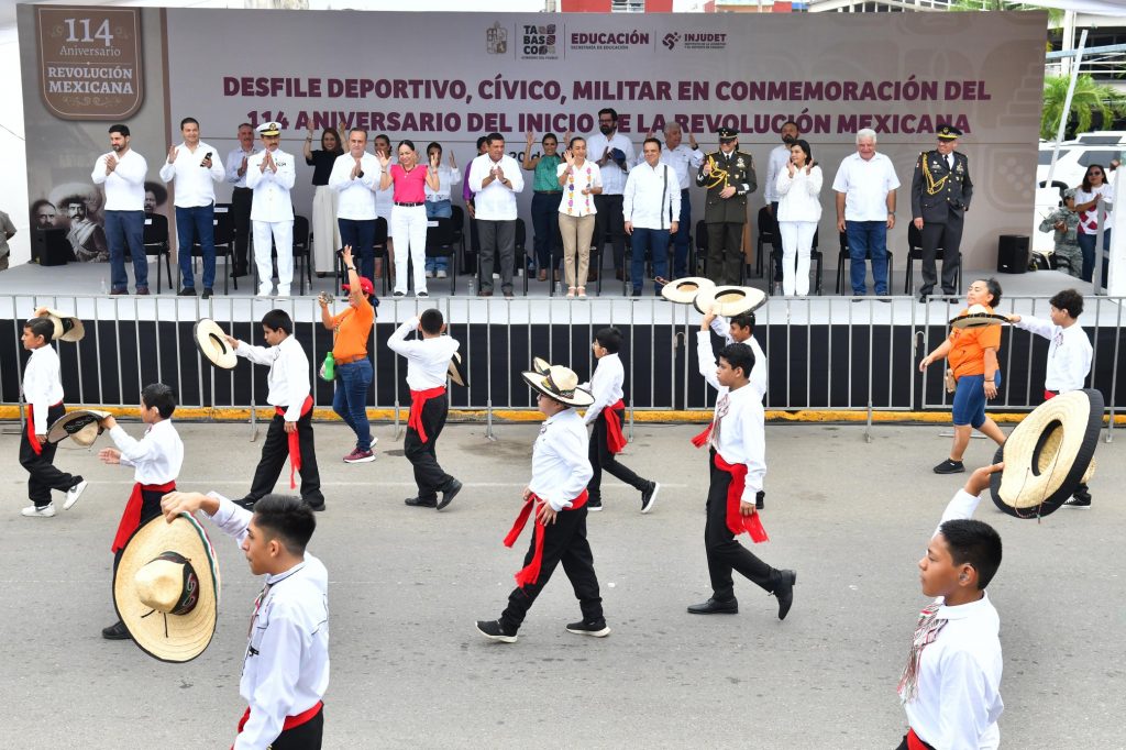 PODER Y CRÍTCA | REDACCIÓN | El Gobierno del Estado de Tabasco celebró el 114 aniversario del inicio de la Revolución Mexicana con un desfile cívico-militar que se realizó este 20 de noviembre, en el que participaron diversas instituciones y fuerzas del orden.