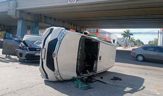 PODER Y CRÍTICA | REDACCIÓN | Un taxi del sindicato “Lázaro Cárdenas del Río” cruzó la carretera federal 307 a altura de la avenida 38 cuando el semáforo le marcaba rojo, lo que hizo que fuera golpeado en un costado por otro automóvil, lo que hizo que quedara semivolcado.