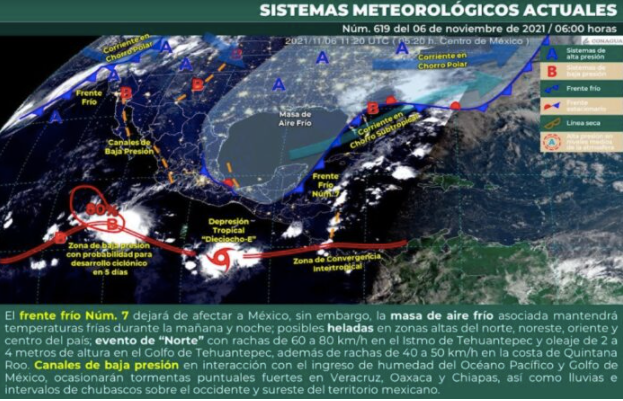 Por último, el Frente Frío No.07, localizado en superficie y se ubica sobre la porción oriental de la república mexicana, porción norte del estado de Tabasco, México, porción central de la Península de Yucatán, porción oriental del golfo de México, porción media de la península de Florida, EUA., y hasta la porción occidental del océano Atlántico, con desplazamiento al este-sureste; genera ligero descenso de temperaturas, nubosidad variable con nubes de tormenta, con lluvias acompañadas de chubascos con probabilidad de actividad eléctrica dispersa, viento frío y arrachado del norte y noreste, influenciando el occidente de la región peninsular y gradualmente al estado de Quintana Roo.