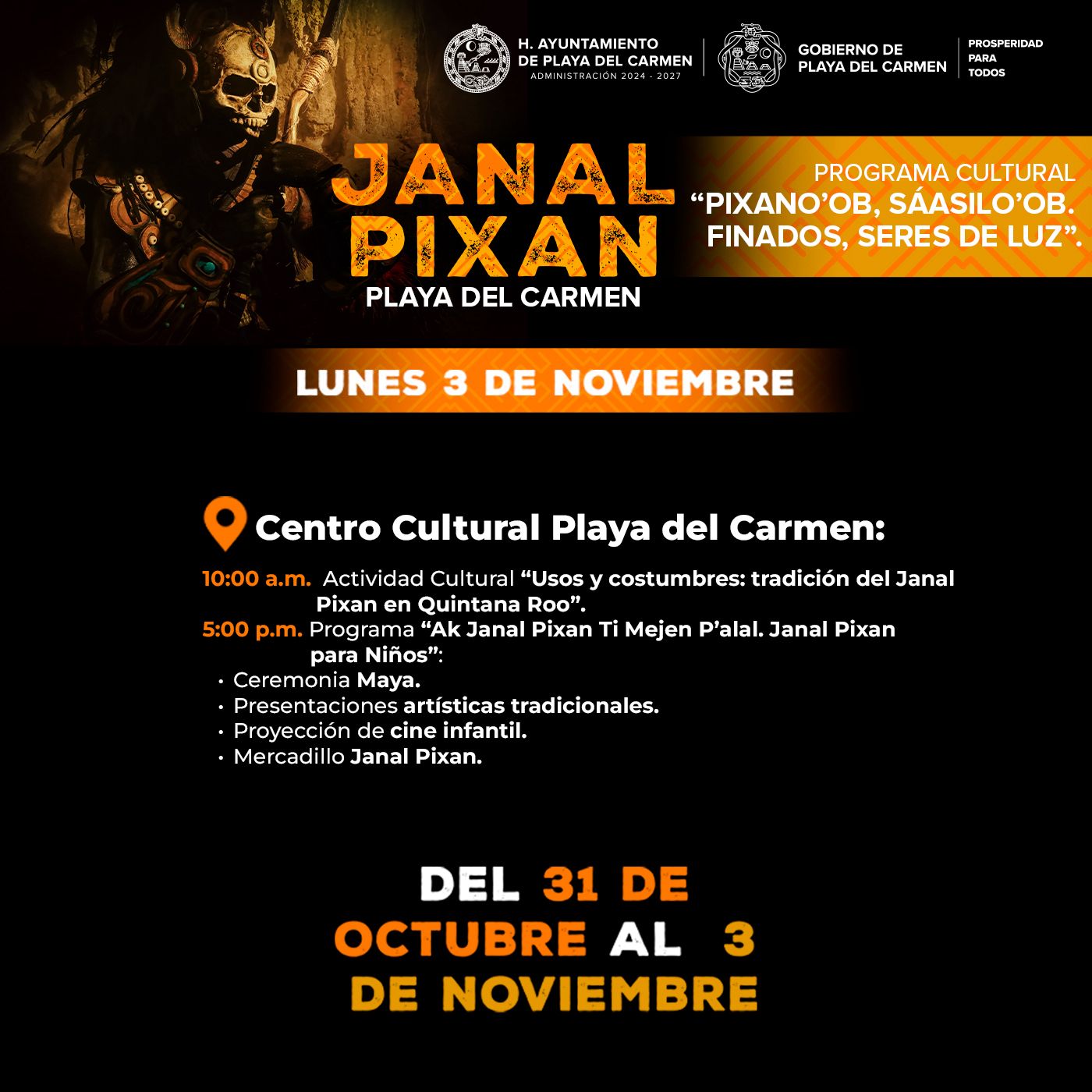 Y a las seis de la tarde del mismo sábado, todas y todos los playenses y visitantes están invitados al recorrido “U Xíimbal Pixano’ob. Paseo de los pixanes” que partirá del parque Lázaro Cárdenas, en la colonia Colosio, hasta el Cementerio Municipal, donde se realizarán los rezos y la serenata a los Fieles Difuntos, a cargo de las rezadoras mayas “Payachi’ob” y el cuarteto Ecos del Mayab.