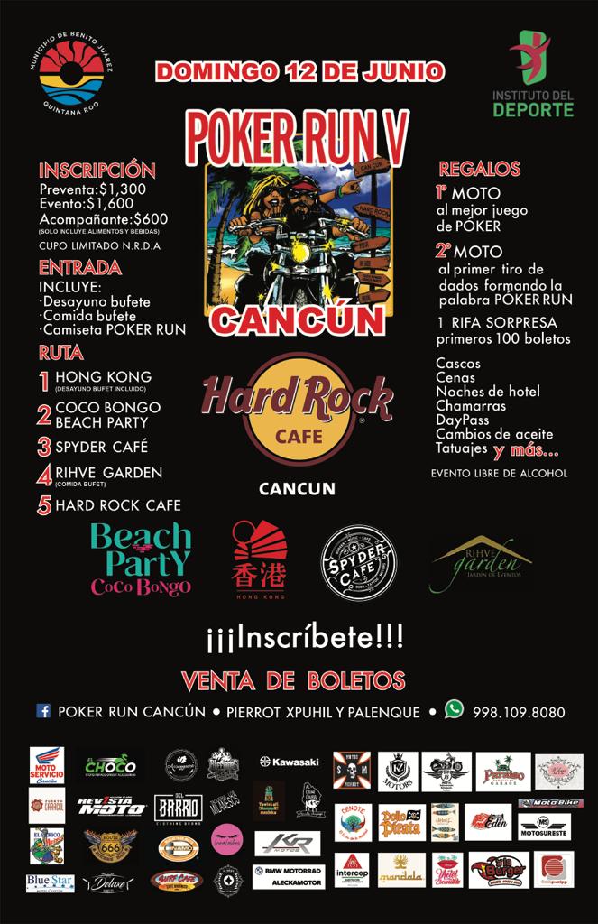 El «Poker Run» se trata de un Rally de motociclistas en la que los participantes tienen que recorrer cinco puntos de la ciudad de Cancún, donde en cada punto realizará un tiro con un cubilete simulando sacar la combinación de una carta de poker, luego de de cumplir los cinco puntos, se combinarán las cartas que hayan sacando y el que tenga la “mejor mano” (de acuerdo al reglamento del poker), será quien se proclame ganador. Cabe resaltar que se trata de un Rally de motociclistas que ya se hacía en Cancún y la última edición se realizó en el 2007.