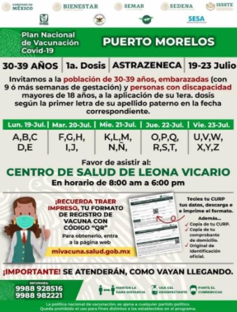 Puerto Morelos, Q. Roo, viernes 16 de julio de 2021, Poderycrítica.- El próximo lunes 19 de julio iniciará, en el Centro de Salud de la comunidad de Leona Vicario, la aplicación de la primera dosis de la vacuna AstraZeneca contra covid-19, a personas de 30 a 39 años de edad, informó la encargada de despacho de la Secretaría municipal de Desarrollo Social, Juanita Chacón Canché.
