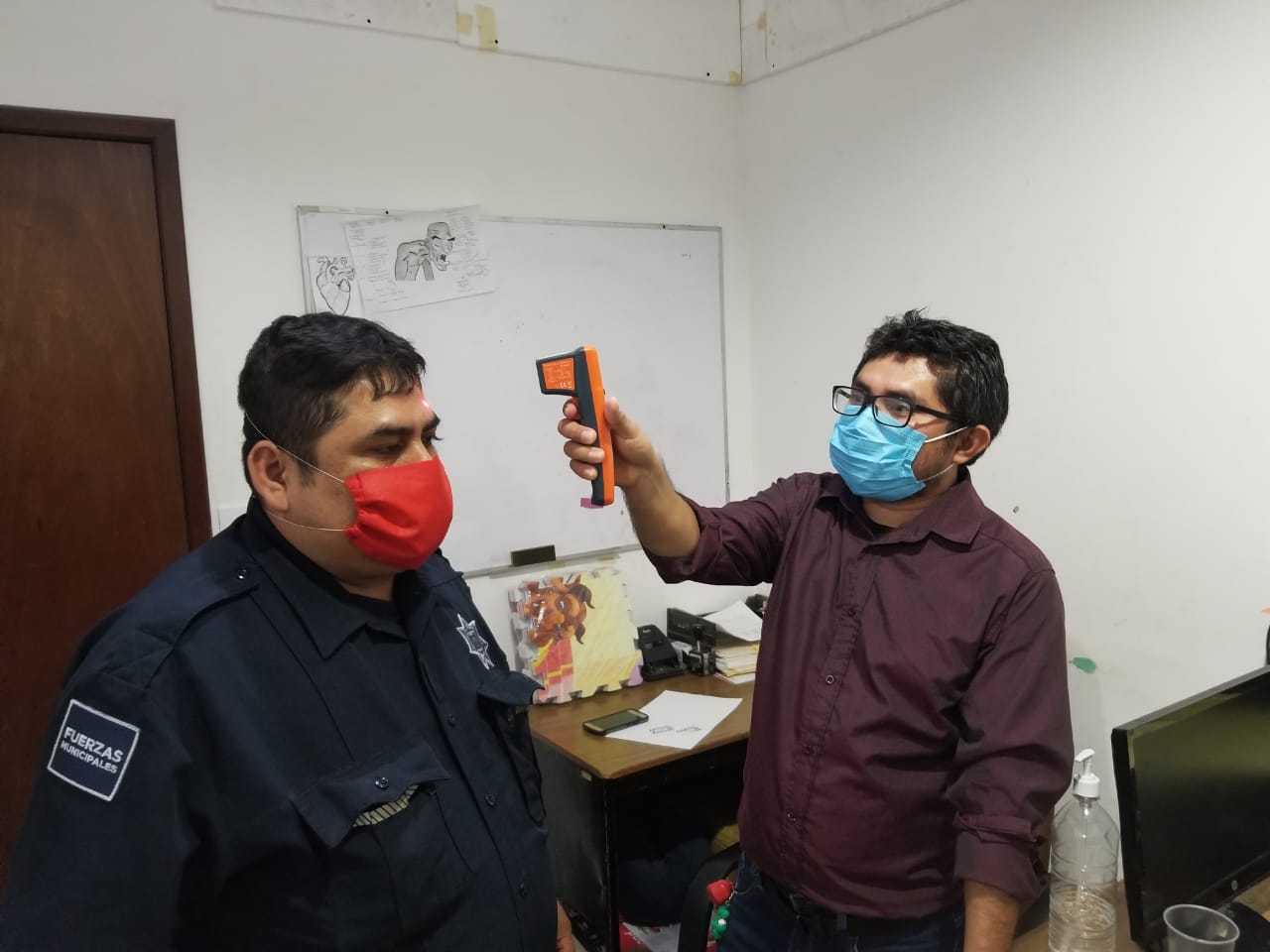 Cozumel, Q. Roo, Viernes 17 de Abril de 2020, poderycrítica.- Para proteger la salud de los elementos, durante la emergencia sanitaria por coronavirus Covid-19, el Presidente Municipal, Pedro Joaquín Delbouis, dio la indicación a la Dirección de Seguridad Pública, de tomar la temperatura a todos los policías de Cozumel para conocer su estado de salud.