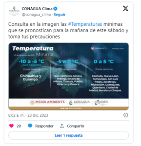 Las condiciones matutinas y nocturnas seguirán siendo frías a muy frías, con heladas en el noroeste, norte, noreste, centro, oriente y sureste de la República. Se espera un ambiente gélido con temperaturas inferiores a -5 °C en áreas de Chihuahua y Durango. Además, se registrarán rachas de viento de componente norte, con velocidades de 40 a 60 km/h en el Istmo y Golfo de Tehuantepec.