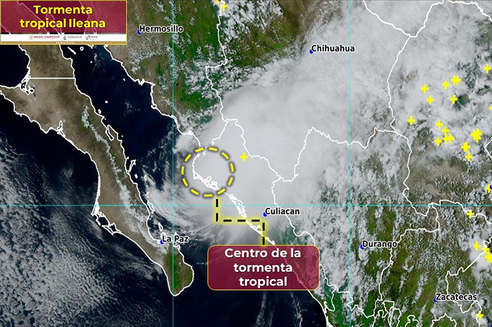En un comunicado, el SMN indicó que a las 15:00 h el centro de la tormenta tropical “Ileana” “se localizaba en tierra en el municipio de Ahome, Sinaloa, a 20 kilómetros (km) al sureste de Topolobampo, Sinaloa, y a 35 km al sur-sureste de Los Mochis, Sinaloa. En las próximas horas se prevé que el sistema continúe debilitándose”, y se reduzca a depresión tropical y posteriormente a baja presión remanente.