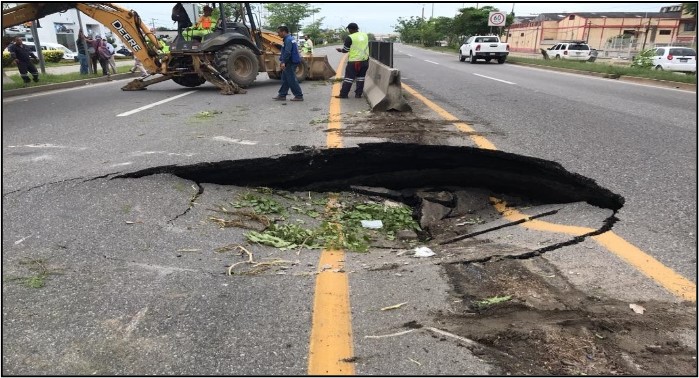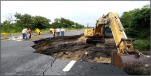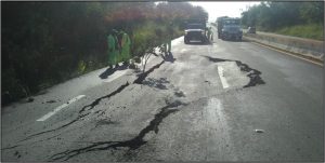 Asimismo, se produjo un hundimiento en el kilómetro 122+520 de la carretera Coatzacoalcos-Villahermosa, tramo Cárdenas-Villahermosa, en los cuerpos A y B. Lo anterior derivado de la fuga de aguas residuales de una tubería de asbesto.