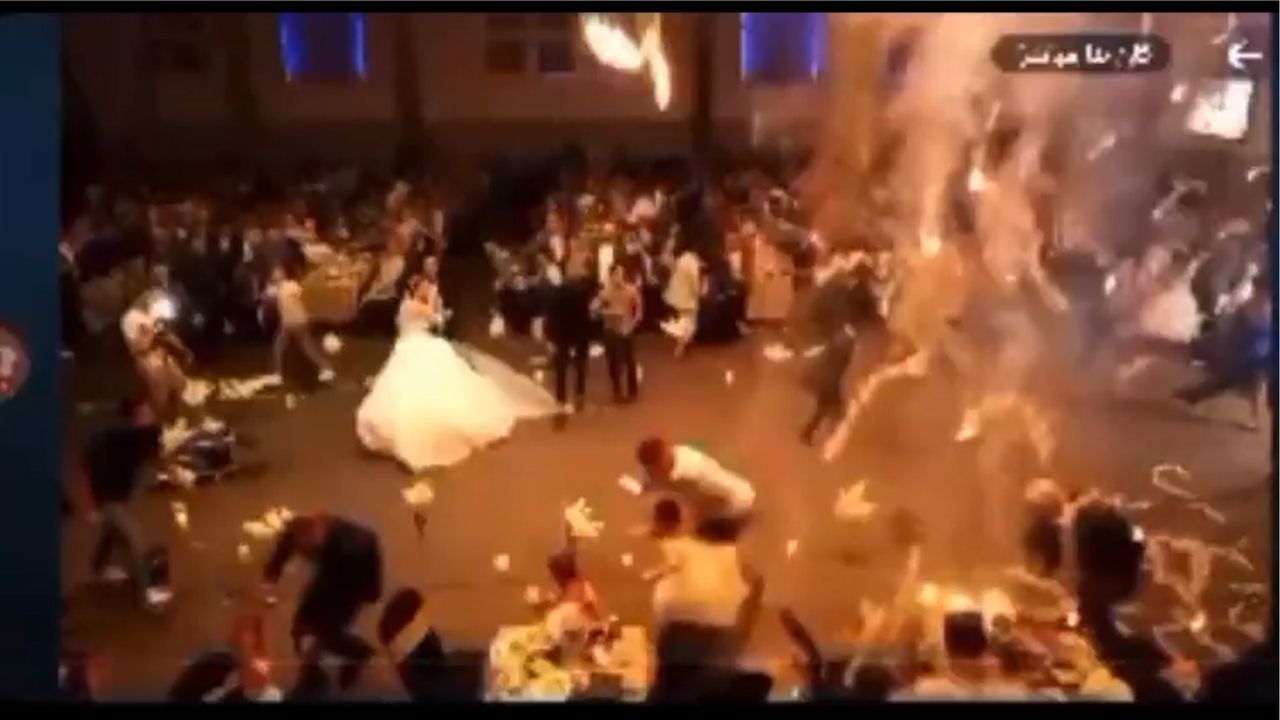 Videos que circulan en las redes sociales muestran a la pareja de novios bailando cuando parte de los adornos en llamas cae sobre la pista de baile.