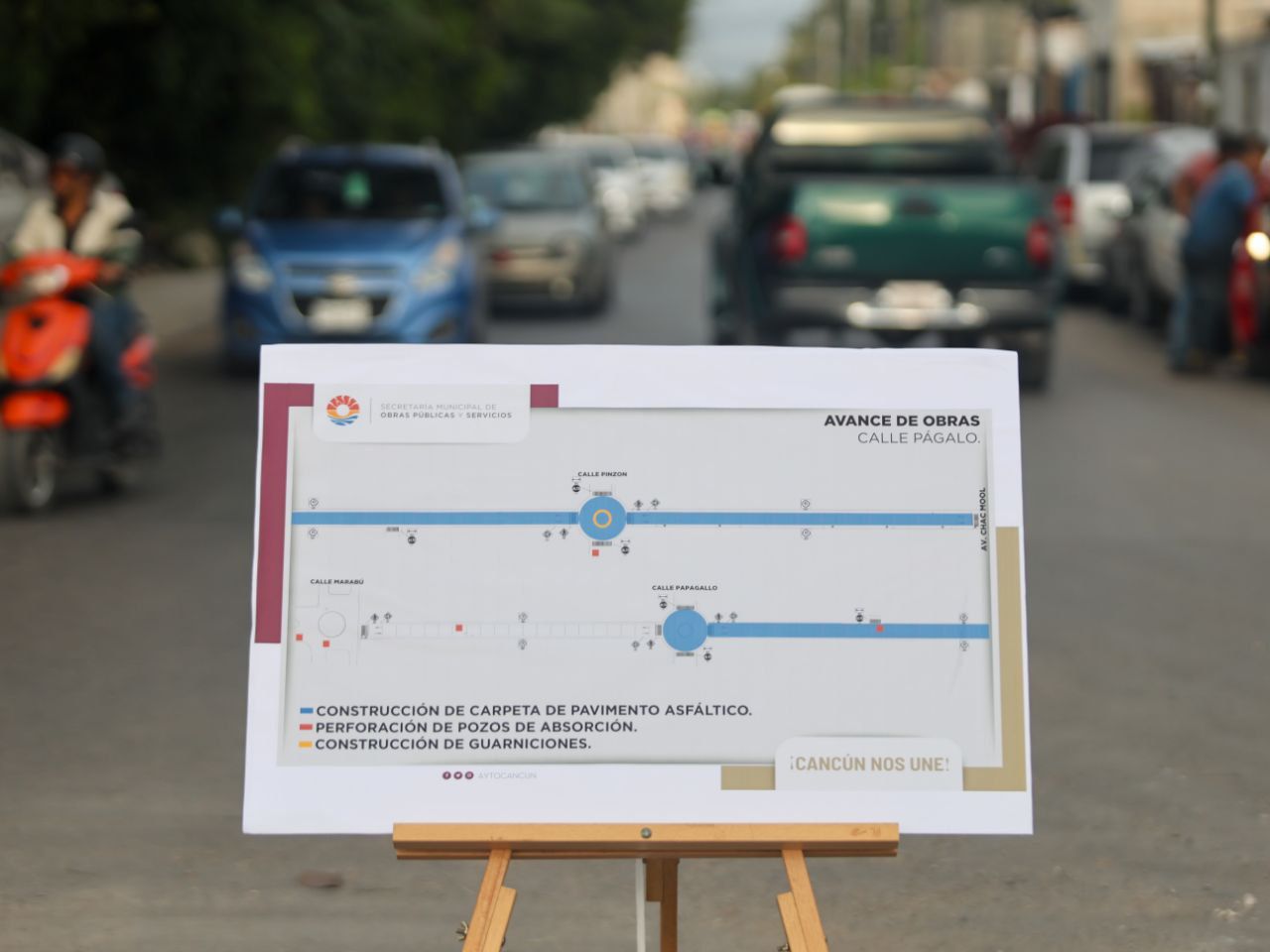 Comentó que entre las obras destacadas, se encuentra la pavimentación de la calle Págalo, entre las avenidas Chac Mool y Marabú, que ya cuenta con un avance del 83 por ciento, la cual no solo contempla la construcción de banquetas con líneas podo táctiles, rampas y señaléticas, sino también el mantenimiento de los pozos de absorción existentes y la construcción de nuevos, para evitar encharcamientos en la calle.