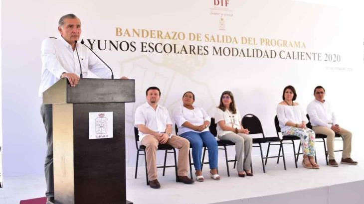 Adán Augusto López precisó que la llamada “modalidad caliente” es producto del esfuerzo e interés de su esposa, Dea Isabel Estrada, por mejorar el esquema nutricional de la niñez, pero también responde a un compromiso asumido en campaña para mejorar la calidad de los desayunos escolares.