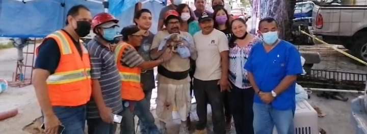 La compañía de arquitecto Paco Díaz apoyó con su personal, el señor Vargas quien operó la maquina, el señor que aparece en la foto general del veterinario Raúl Rosado, encargado de Control Animal, abrazando al cachorro.