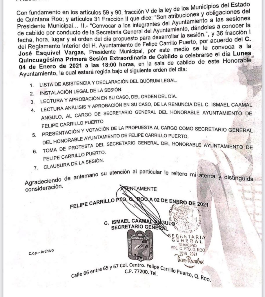 Es el propio Ismael Caamal convocó a la Quincuagésima Sesión Extraordinaria de Cabildo a celebrarse este lunes 04 de enero de 2021 a las 18:00 horas.