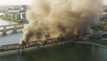 TREN SE DESCARRILA E INCENDIA SOBRE UN PUENTE EN ARIZONA