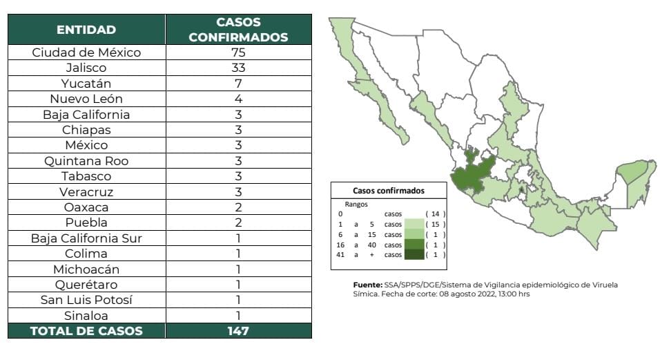 Con corte al 08 de agosto, se han identificado 390 casos que cumplen con la definición operacional de caso probable, de los cuales 147 son confirmados, con resultado positivo por el InDRE, indica el Informe Técnico Semanal de la Vigilancia Epidemiologica de Viruela Símica en México.