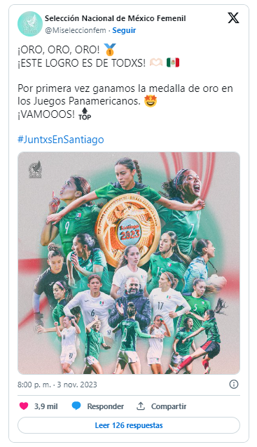 Por primera vez en la historia, las futbolistas aztecas ganan un oro Panamericano; la última oportunidad que habían tenido fue en 1999, cuando Estados Unidos se impuso y les dejó la plata.
