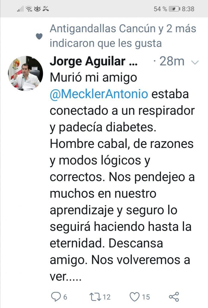 En su tweet, Jorge Aguilar informó que Antonio Meckler estaba conectado a un respirador y padecía diabetes.