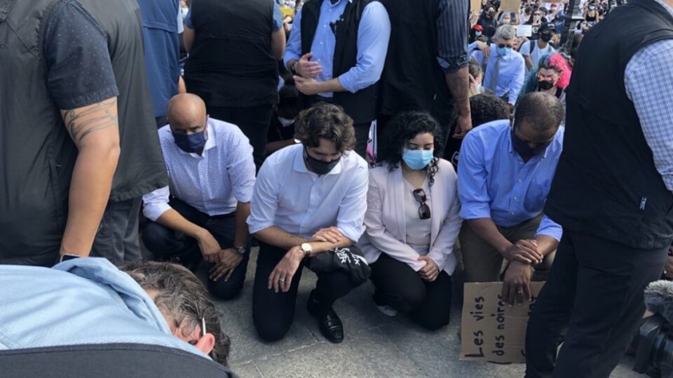 Trudeau, con una mascarilla de tela negra, llegó al Parlamento en Ottawa acompañado de guardias de seguridad. Después de que algunos manifestantes le pidieran arrodillarse, lo hizo, tras lo cual le agradecieron. Inclinó la cabeza mientras los participantes coreaban «Black lives matter».