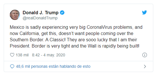 “Tristemente México está experimentando muy grandes problemas con CoronaVirus, y ahora California, que entiende esto, no quiere que la gente cruce la frontera sur. ¡Un clásico! Tienen tanta suerte de que yo sea su Presidente. ¡La frontera es muy estrecha y el muro se está construyendo rápidamente!”, escribió el mandatario en Twitter.