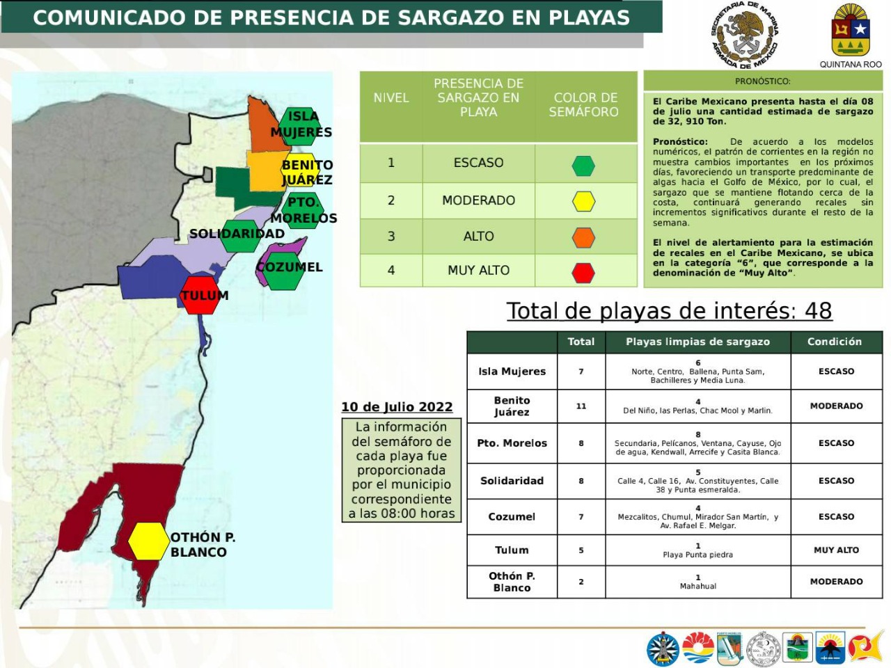 En total se monitorean 48 playas: 7 en Isla Mujeres, 11 en Benito Juárez, 8 en Puerto Morelos, 8 en Solidaridad, 7 Cozumel, 5 Tulum y 2 de Othón P. Blanco.