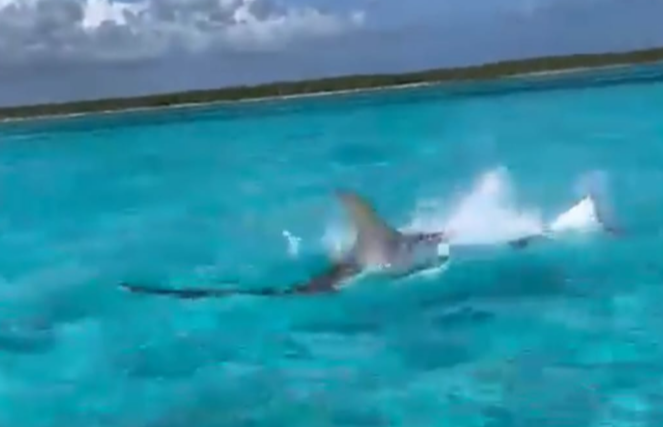 Sin embargo, en los 43 segundos que dura el material no se logra apreciar si finalmente el tiburón consigue capturar a la mantarraya, pues la persona que captó este momento detiene la grabación.