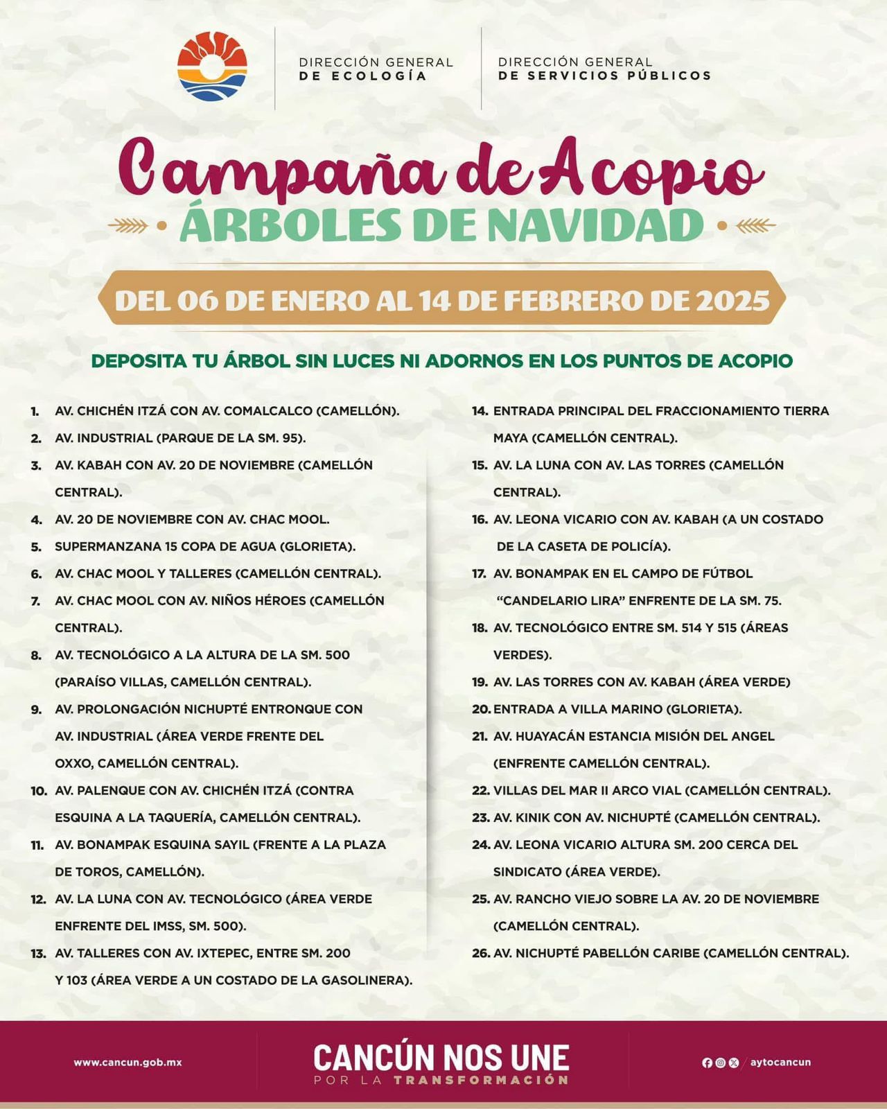 Las y los cancunenses pueden acudir a cualquiera de los 26 puntos de acopio instalados en la ciudad, donde tendrán llevar sus árboles sin adornos, es decir, no luces, esferas, cintas, ni muñecos, entre otros accesorios.
