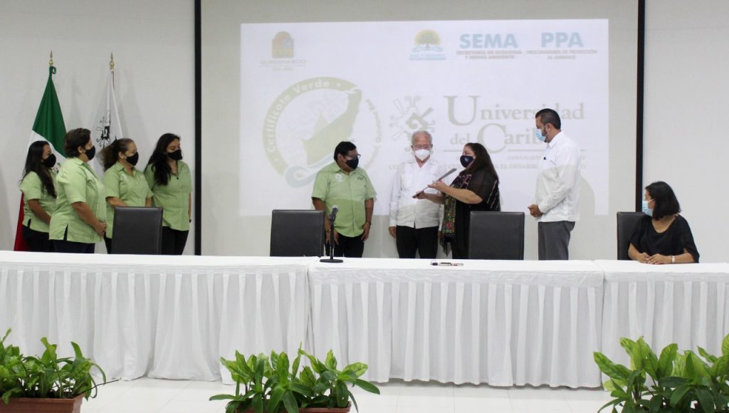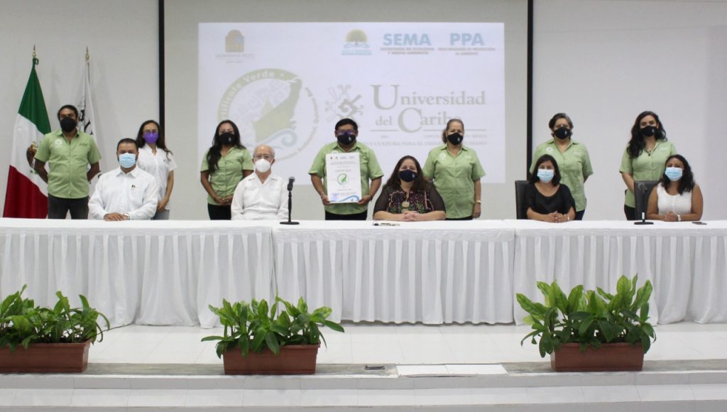 Cancún, Q. Roo, miércoles 22 de septiembre de 2021, poderycrítica.- La Universidad del Caribe se convirtió en la primera institución educativa de la entidad en recibir, de parte de la Secretaría de Ecología y Medio Ambiente (SEMA), el Distintivo “Quintana Roo Verde”; certificado que el Gobierno del Estado otorga a través de la Procuraduría de Protección al Ambiente a las empresas e instituciones que cuenten con un desempeño ambiental superior al exigido por la legislación vigente.