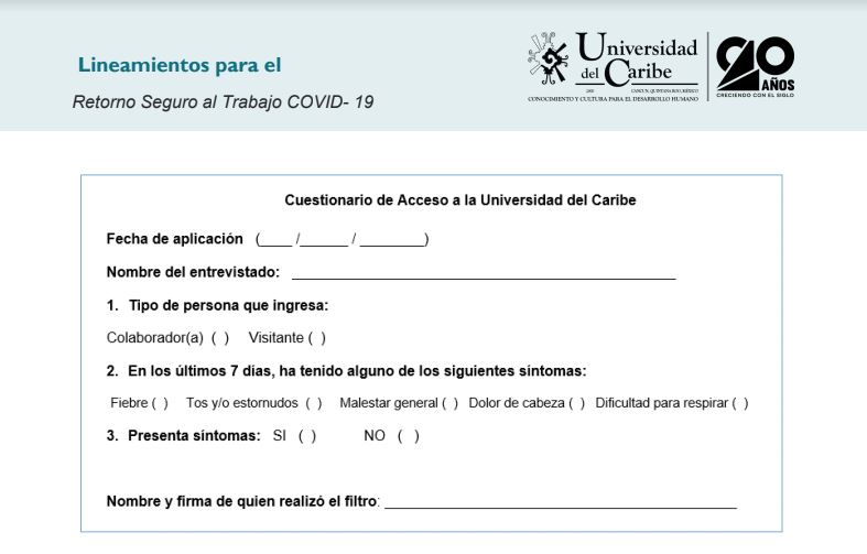 A fin de cumplir con todas las medidas de prevención que marcan las autoridades de Salud, ante la Nueva Normalidad, la Universidad del Caribe estableció los LINEAMIENTOS PARA EL RETORNO SEGURO AL TRABAJO COVID-19, documento que ya se encuentra publicado en nuestra página oficial Unicaribe.mx, el cual invitamos a consultar.