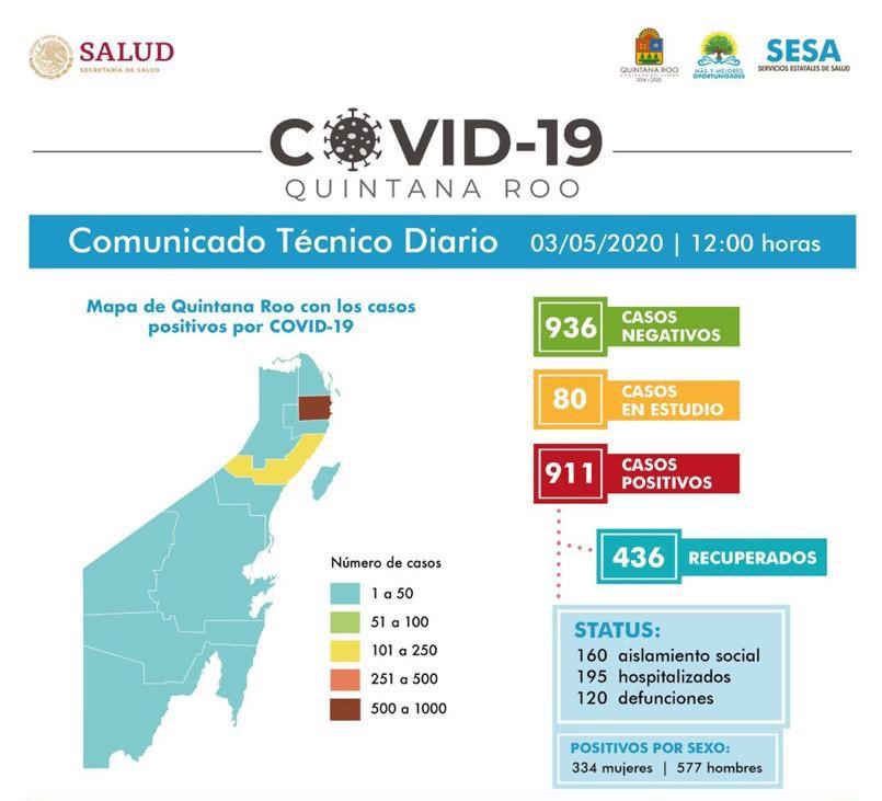 Chetumal, Q. Roo, Domingo 03 de Mayo de 2020, poderycrítica.- La Secretaría de Salud en el Estado informó que este domingo al mediodía se tienen contabilizados de manera oficial 911 casos positivos de coronavirus en Quintana Roo.