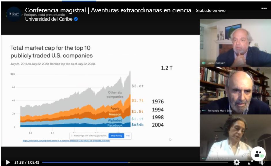 Cancún, Q. Roo, Viernes 23 de Octubre de 2020, poderycrítica.- “La ciencia importa, es algo que tenemos que entender, porque cambia nuestras vidas, las reglas, la sociedad, el futuro de nuestros empleos y la manera de generar riqueza”, afirmó el reconocido científico, arquitecto y autor de bestsellers, Dr. Juan Enríquez Cabot, en el marco del XX Aniversario de la Universidad del Caribe.