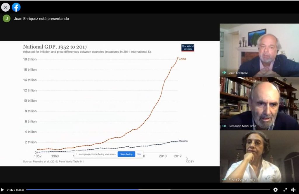 Por tanto, consideró que no nos debe sorprender que desde los años 70, la economía de nuestro país se estancó, mientras que la del país asiático se disparó, ya que crearon empresas y educaron a sus jóvenes en ciencia y tecnología, y México, no. Agregó que China le siguió el paso y dos compañías, Tencent y Baidu, fundadas en 1998 y en el 2000, salieron al mercado de valores a vender acciones y estas dos compañías valen lo mismo que vale la economía de todo México; lo mismo Apple, Amazon o Google.