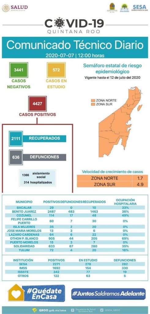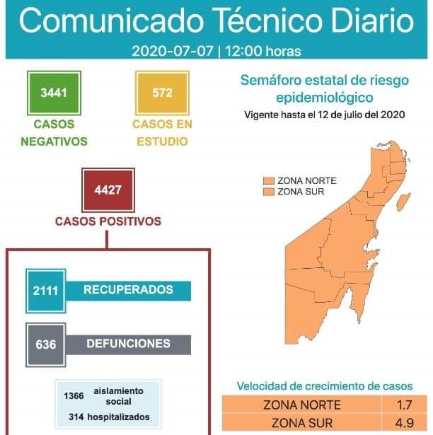 «Hasta las 12 horas del 7 de julio, se han notificado 3441 casos negativos, 572 en estudio, 4427 positivos, 636 defunciones y 2111 personas recuperadas a Covid-19», informó la Secretaría de Salud.