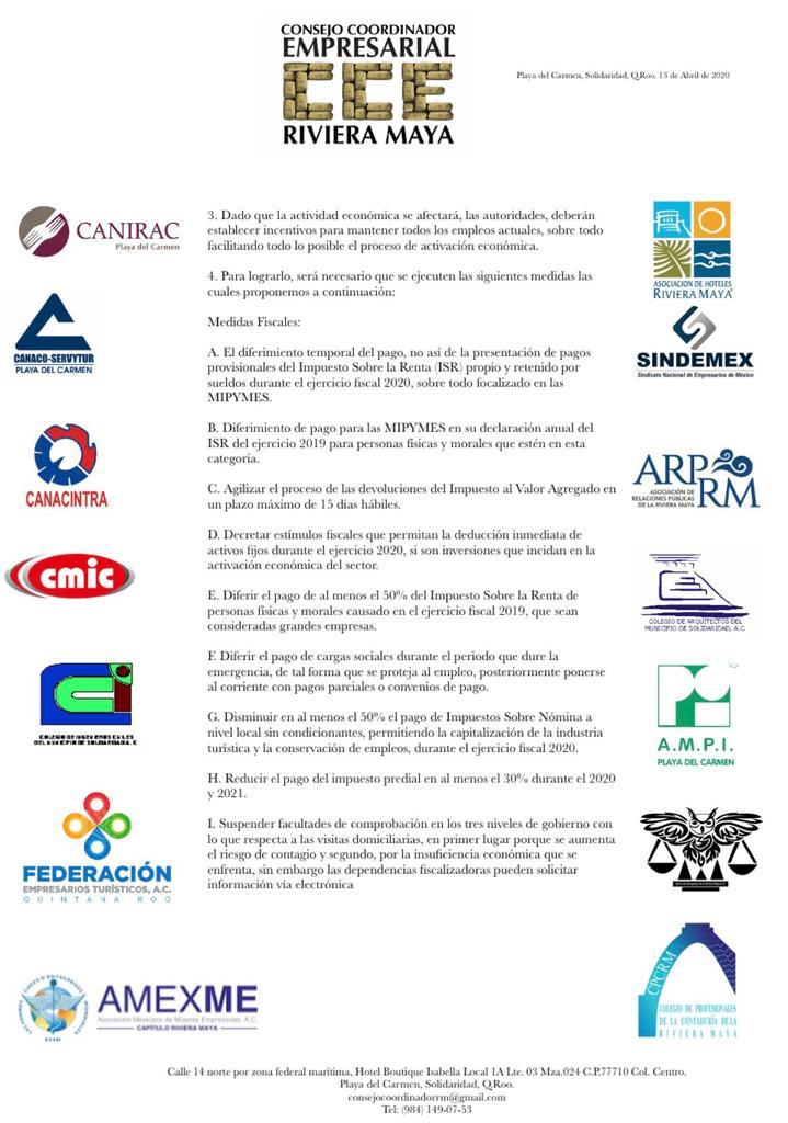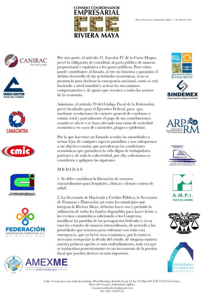 “La economía en nuestra región descansa fundamentalmente en el ramo turístico, siendo nuestros principales visitantes de origen extranjero”, prosiguió. “Sin embargo, debido a la emergencia sanitaria generada por el COVID-19, turistas provenientes de Europa, Asia, Norte y Sur América, han cancelado de manera masiva sus viajes y reservaciones, por lo que la actividad económica está a punto de colapsar en el estado”, advirtió.
