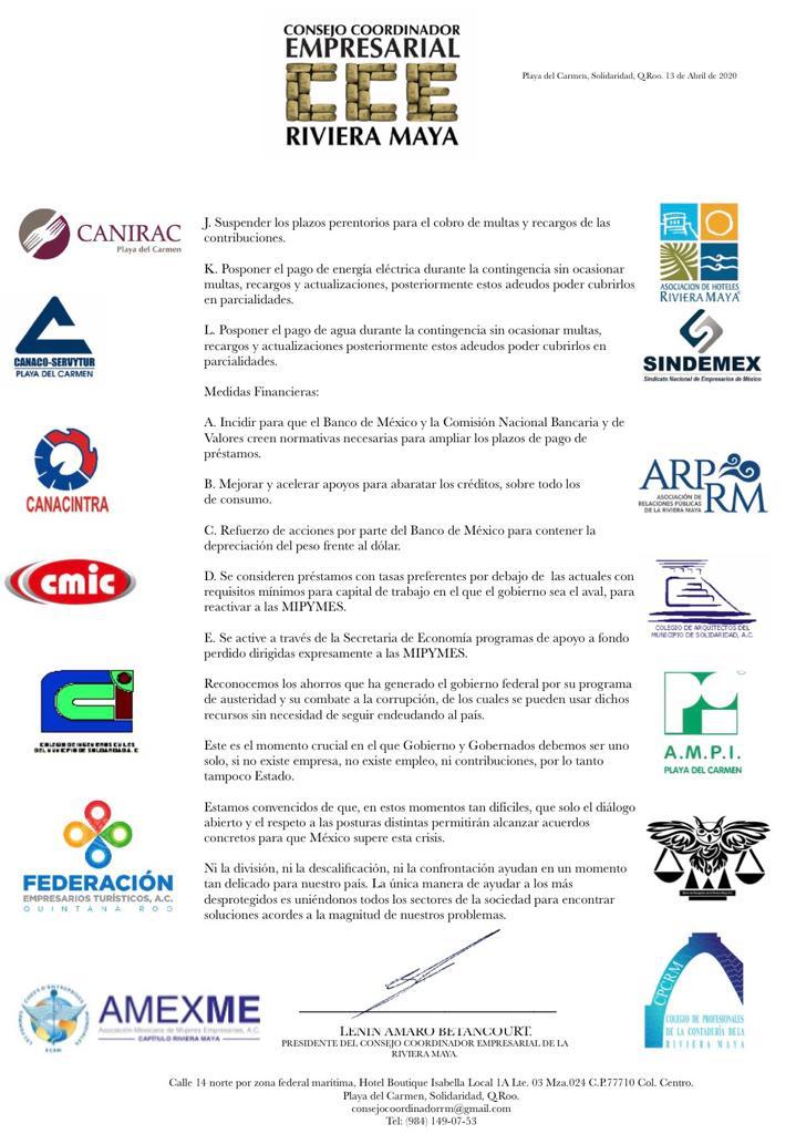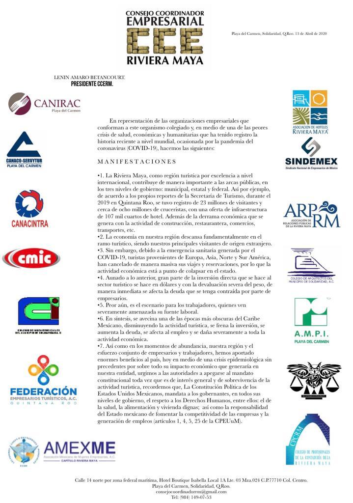 Solidaridad, Q. Roo, Lunes 13 de Abril de 2020, poderycrítica.- El presidente del Consejo Coordinador Empresarial de la Riviera Maya (CCERM), Lenin Amaro Betancourt en representación de las organizaciones empresariales que conforman el organismo colegiado y, en medio de una de las peores crisis de salud, económicas y humanitarias ocasionadas por la pandemia del coronavirus (COVID-19) hace un llamado a todas las autoridades de los tres órdenes de gobierno a activar mecanismos compensatorios y de apoyo que rescaten a todos los actores de la economía para que prevalezcan las condiciones económicas que garanticen la vida digna de trabajadores, patrones y de toda la colectividad.
