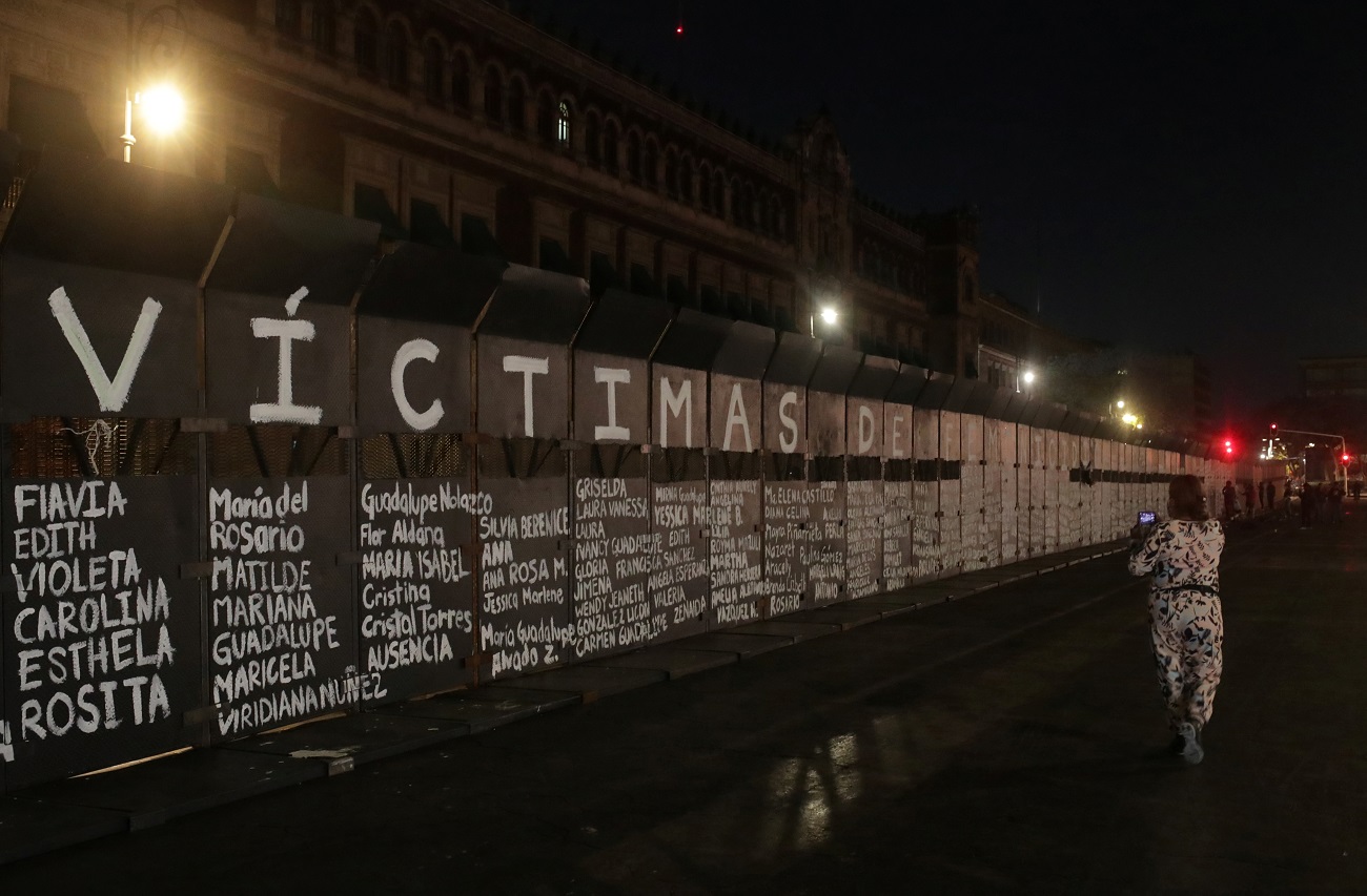 México, 08 marzo; poderycrítica.-Una larga valla de metal que fue colocada el viernes frente al Palacio Nacional de México, despacho y casa presidencial, fue transformado la noche del sábado por colectivas feministas y amaneció convertida este domingo en un «muro de memoria».