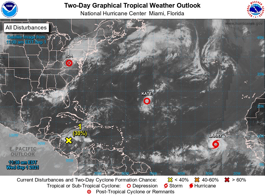 La noche del martes la baja presión ubicada frente a las costas de África, evolucionó a tormenta tropical “Larry”, se ubicaba hoy (miércoles) a las 4:00 horas a 6,640 kilómetros de las costas de Quintana Roo. Ambos sistemas no representan riesgo por el momento para las y los quintanarroenses.
