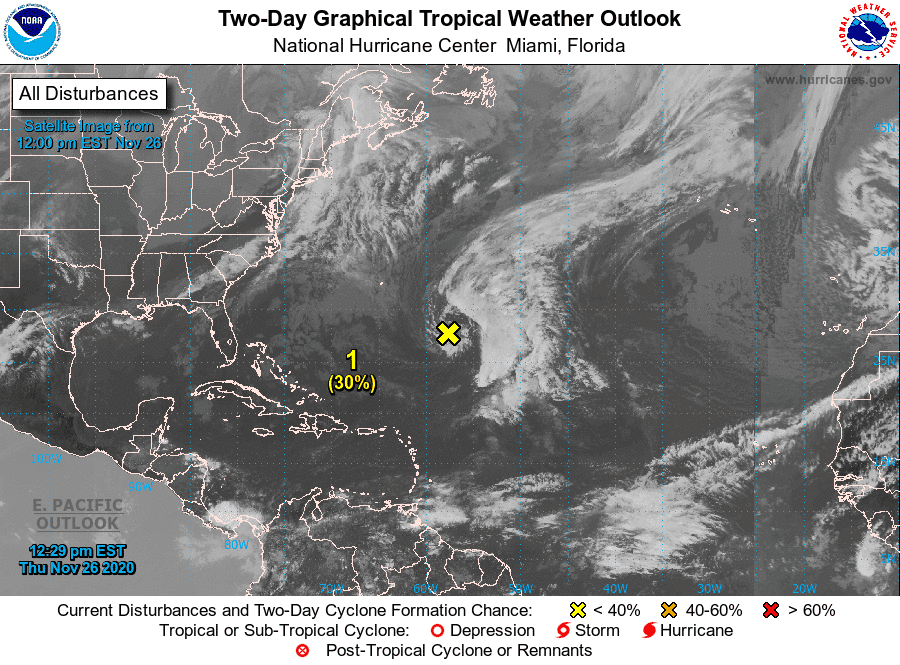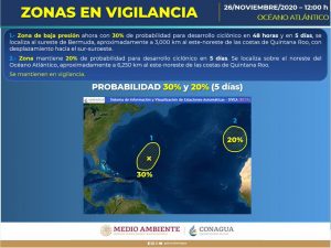 Cancún, Q. Roo, Jueves 26 de Noviembre del 2020, poderycrítica.- Este jueves, la Comisión Nacional del Agua (Conagua), informó que se mantiene en vigilancia dos zonas de baja presión presión en el Océano Atlántico con probabilidad de desarrollo ciclónico en las próximas 48 horas y cinco días.