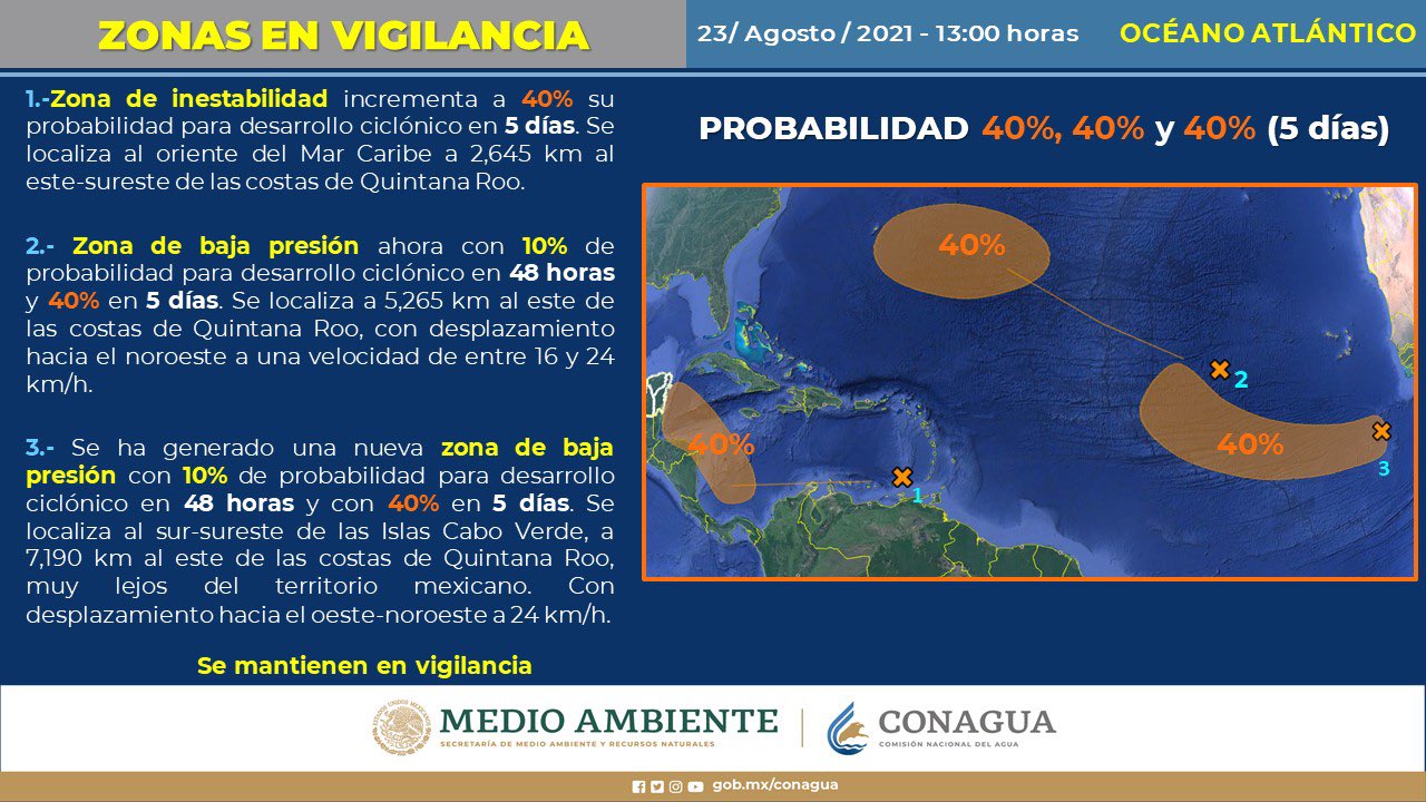 Cancún, Q. Roo, Lunes 23  de Agosto de 2021, poderycrítica.-  A través de la página oficinal de protección civil nos informan que el Servicio Meteorológico Nacional de México  mantiene en vigilancia una zona de inestabilidad y dos zonas de baja presión en el océano Atlántico.