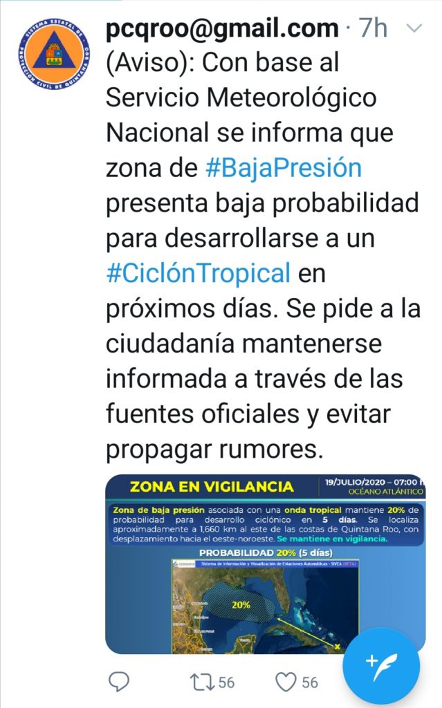 El Sistema Estatal de Protección Civil de Quintana Roo difundió en sus redes sociales esta información.
