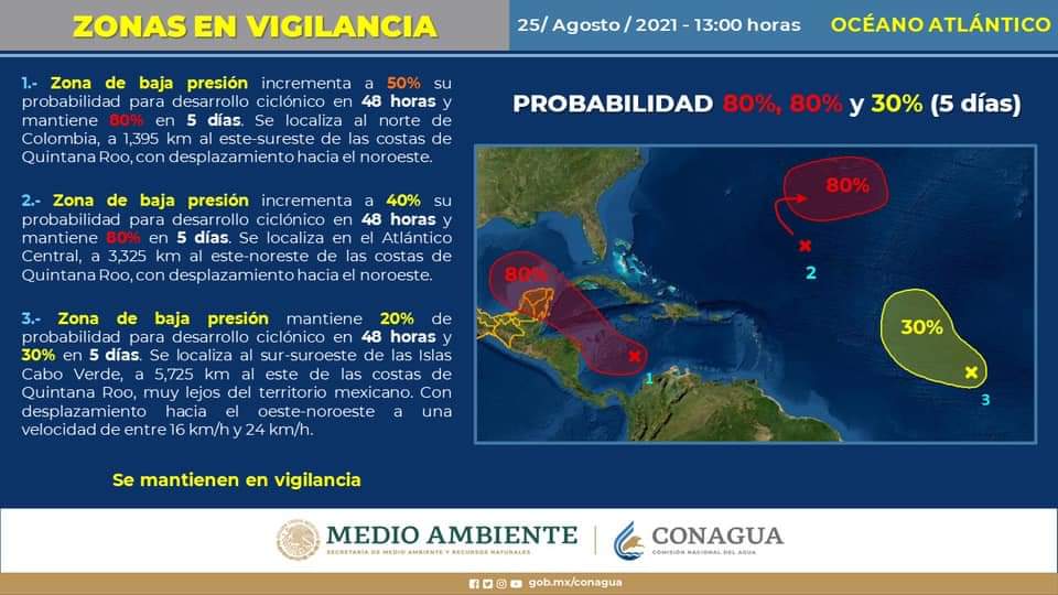 Cancún, Q. Roo, Miércoles 25 de Agosto de 2021, poderycrítica.- La zona de baja presión del mar Caribe presenta 50% a 48 horas y 80% a cinco días de probabilidad de evolucionar en un sistema ciclónico, se ubica a 1,395 kilómetros al este sureste de las costas de Quintana Roo, se desplaza hacia el noroeste.