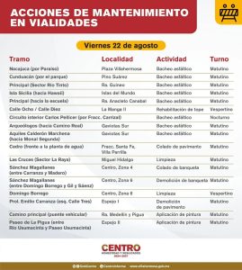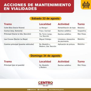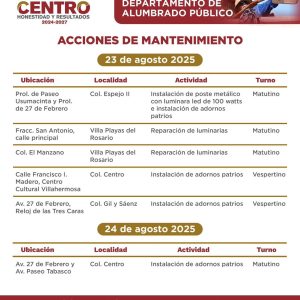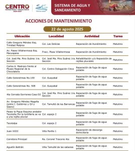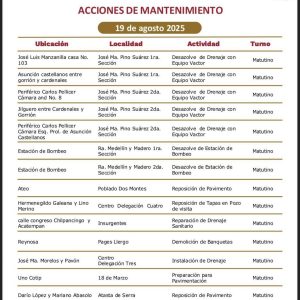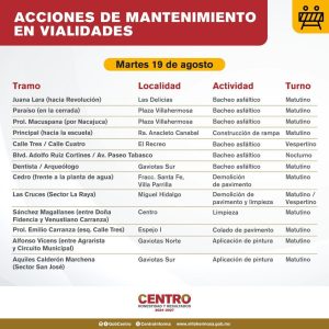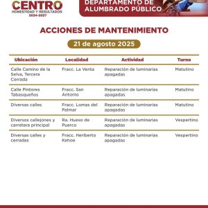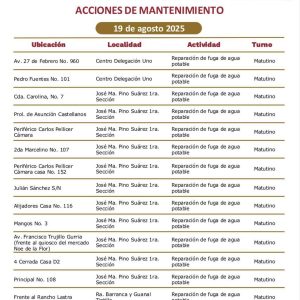 En los últimos días los ‘frentes de trabajo’ se llevaban a cabo en el fraccionamiento Flores del Trópico; Calle Río Usumacinta, Col. Espejo II; Calle Gustavo Hernández, Col. 18 de Marzo; Calle Cunduacán, Col. Pino Suárez; Islas Sicilia, Fracc. Islas del Mundo; Principal, R/a Guineo 1ª Sección.