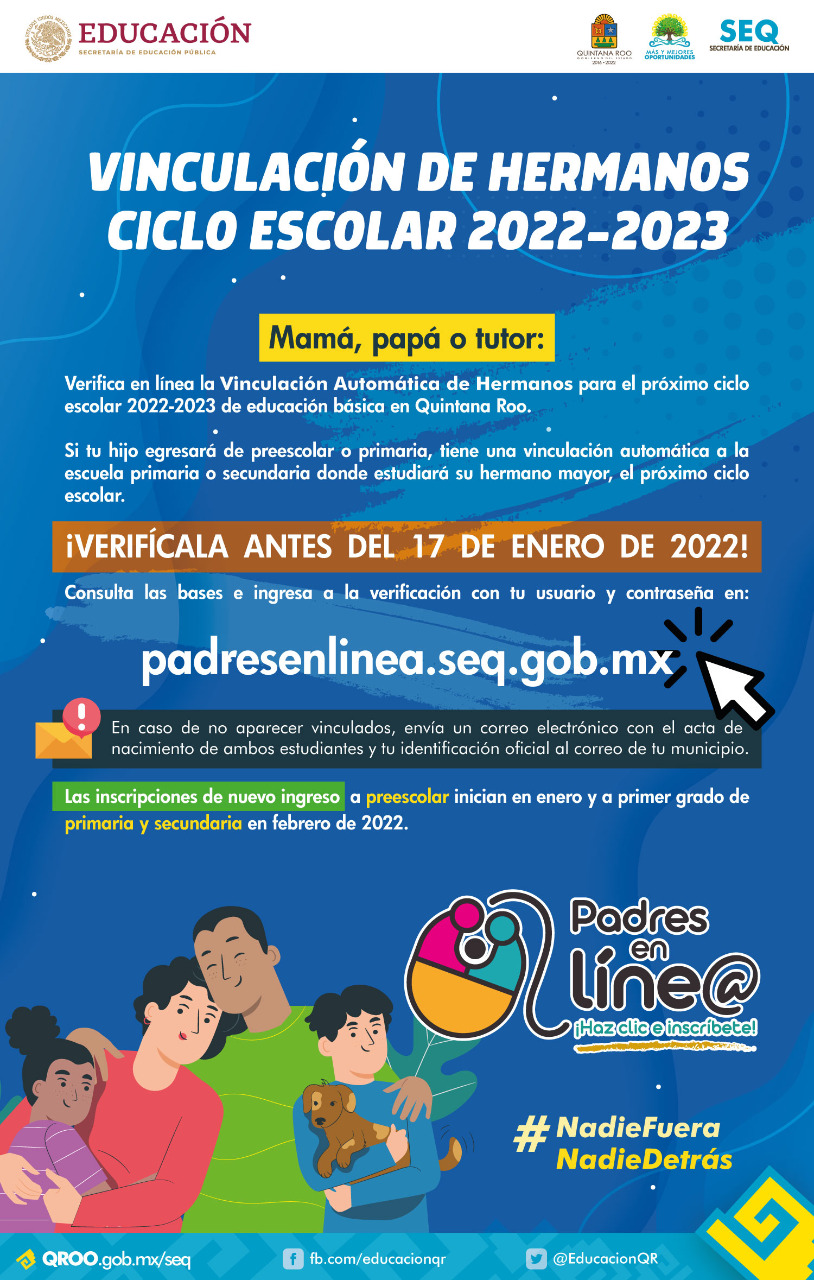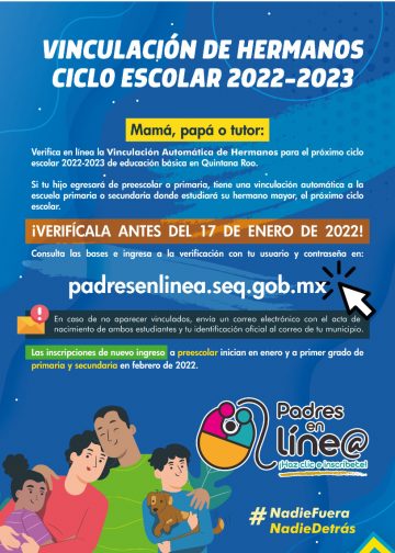 Chetumal, Quintana Roo, Lunes 22 de Noviembre del 2021, Poder y Crítica | La Secretaría de Educación de Quintana Roo (SEQ) informa a padres de familia y tutores, que a partir del 22 de noviembre podrán ingresar y verificar en el portal de Padres en Línea https://padresenlinea.seq.gob.mx/ que sus hijas, hijos, gemelos o trillizos que cursan en el ciclo escolar actual e ingresarán a primer grado de primaria o primer grado de secundaria en el ciclo escolar 2022-2023, se encuentran vinculados con su hermano o hermana para que queden inscritos en la misma escuela.