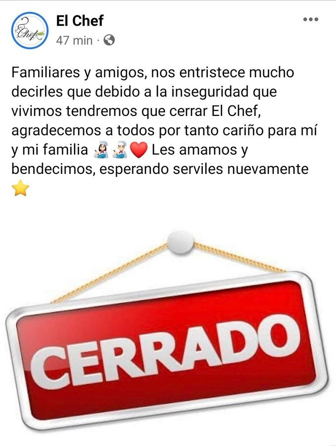 Ante esta ola de violencia y cobros por “Derecho de Piso” este día el popular restaurante “El Chef” anuncio el cierre; hace 24 horas en “El Aguachile” asesinaron al guardia de seguridad y dejaren un mensaje intimidatorio. En esta quincena vas 7 atentados a negocios por no pagar “derecho de piso”.