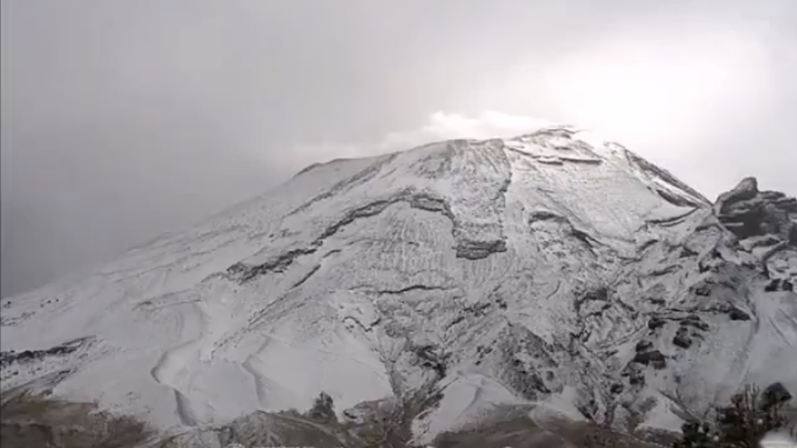 VOLCÁN POPOCATÉPETL AMANECE NEVADO Y LANZA MATERIAL INCANDESCENTE