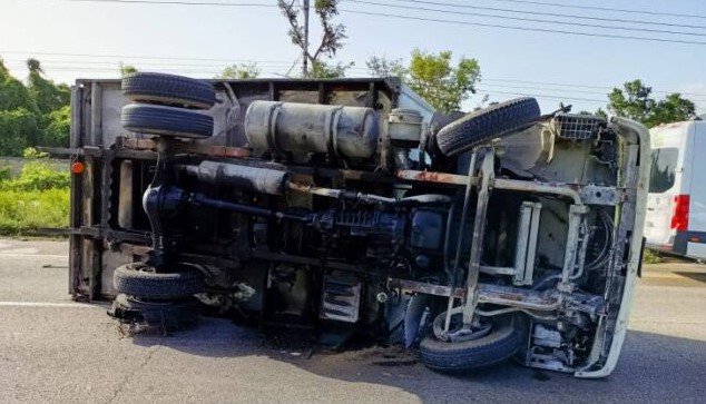 Playa del Carmen, Q. Roo, jueves 02 de septiembre de 2021, poderycrítica.- Un camión de carga volcó esta mañana, alrededor de las 9:20 horas, en el tramo carretero que va hacia Tulum, a la altura del hotel Hard Rock.