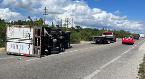 Playa del Carmen, Q. Roo, miércoles 03 de noviembre de 2021, poderycrítica.- Sólo daños dejó una aparatosa volcadura de un camión de carga, cuyo conductor perdió el control de la unidad, debido al exceso de velocidad en que circulaba.
