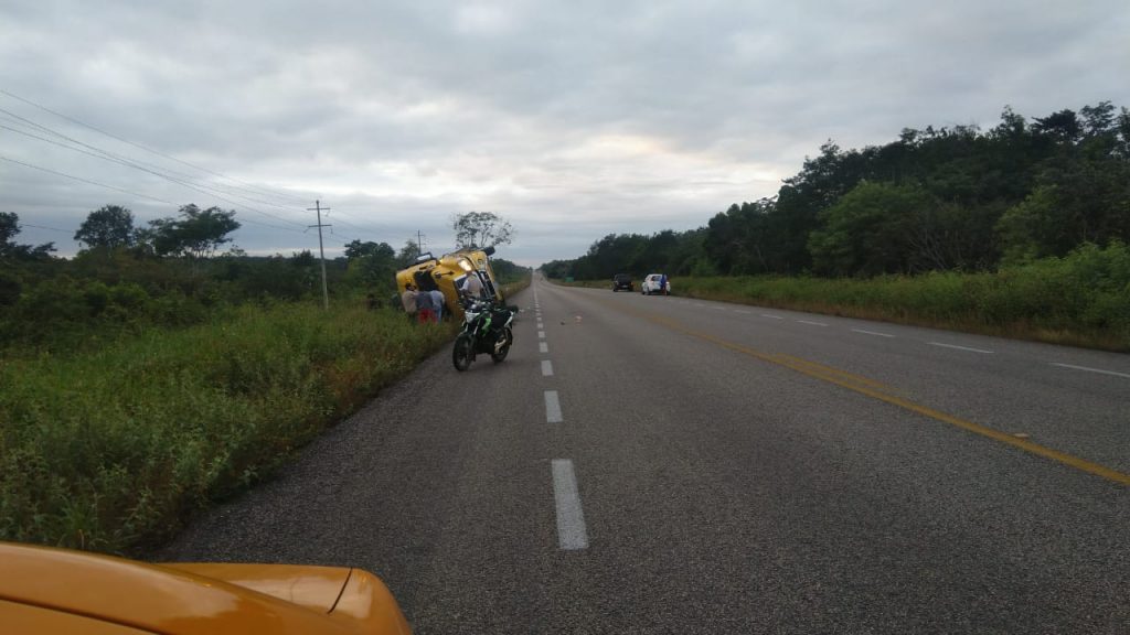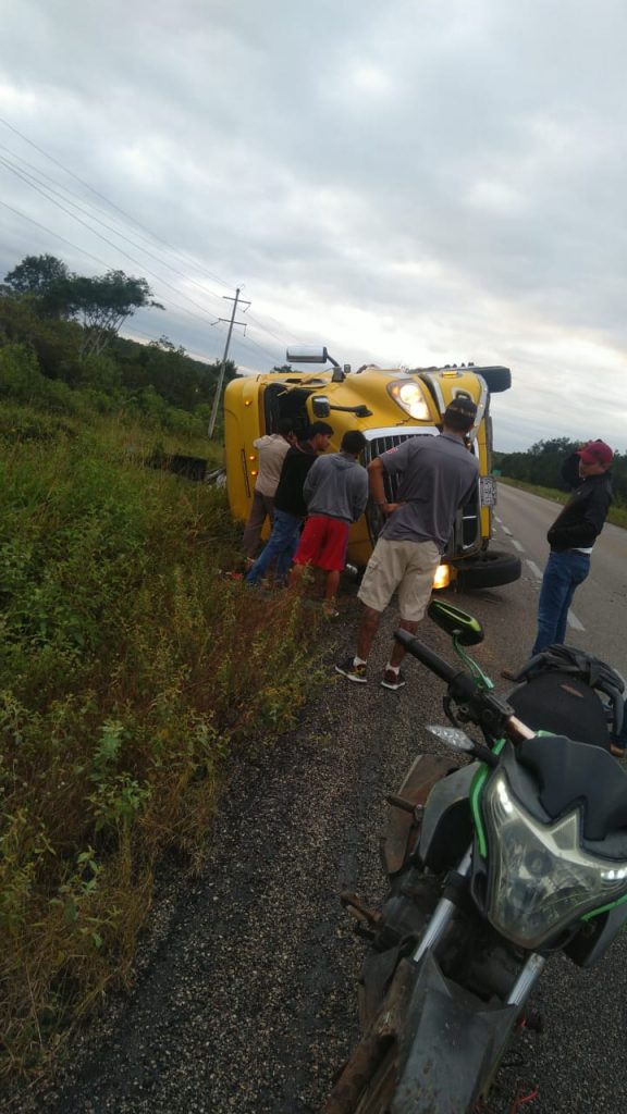 Felipe Carrillo Puerto, Q. Roo, Lunes 18 de enero de 2021, poderycrítica.- Un camión que trasladaba vidrio terminó volcado en la carretera Andrés Quintana Roo – Noh Bec en el municipio de Felipe Carrillo Puerto.