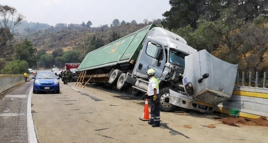 De acuerdo con los primeros reportes, el conductor del tractocamión, cargado con 24 toneladas de neumáticos, perdió el control y chocó contra el muro de contención, lo que provocó que el tráiler quedara volcado y perdiera el eje trasero de las llantas.