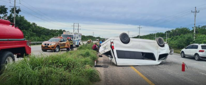 Playa del Carmen, Q. Roo, jueves 07 de Octubre de 2021, poderycrítica.- El conductor de una van de servicio turístico volcó la mañana de hoy sobre la carretera federal entre esta ciudad y Tulum, a la altura del parque Xel-Há.